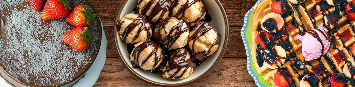 Delicious Light Cream Filled Choux Pastry Drizzled With Chocolate Sauce & Comes With Any One Your Favourite Sauce. Comes With 1 Scoops Vanilla Ice Cream.